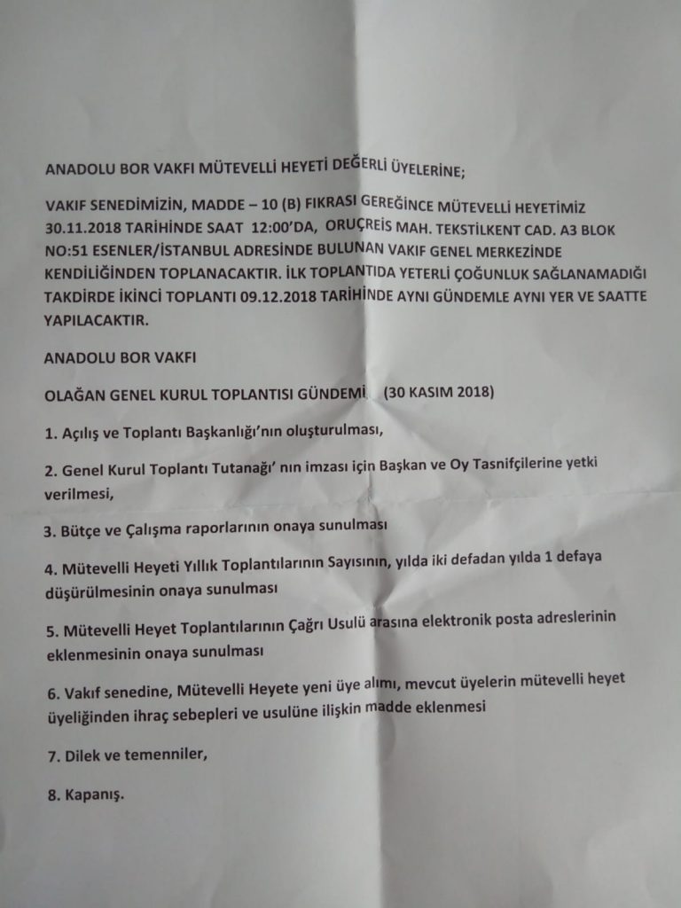 Anadolu Bor Vakfı Mütevelli Heyeti Değerli Üyelerine;